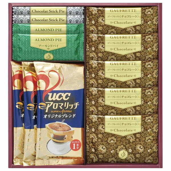 【ギフト対応】 <コーヒー 内祝い お返し>作りたてのおいしさ・コクのある苦味とまろやかな味わいのアロマリッチドリップコーヒーと、サックリとしたアーモンドパイや やさしい甘さのショコラスティックパイ、上品な味わいのチョコゴーフレットの詰合せセット。ホッとしたひと時を演出します。 商品内容:●チョコゴーフレット×5、アーモンドパイ×2、ショコラスティックパイ×2、UCCアロマリッチオリジナルブレンド8g×3●加工地:日本●【賞味期間】製造日より(約)常温180日間●アレルギー【卵・乳・小麦】●箱サイズ(約)25.5×27.5×4cm●箱重量(約)270g●梱包状態:化粧箱入 ※のし包装(ラッピング)はひとつずつ無料で致します。 ●あらゆるギフトシーンにどうぞ 内祝い・お返し・出産・出産内祝い・結婚・結婚内祝い・おしゃれ・御礼・快気祝い・快気内祝い・御見舞御礼・全快祝い・お祝い・祝い返し・結婚式・引き出物・結婚祝い・結婚内祝い・ 引越しご挨拶・父の日・母の日・敬老の日・入学内祝い・入園内祝い・成人式・初節句・新築内祝い・粗品・記念品・二次会・景品・周年記念・コンペ景品・プレゼント・誕生日・お中元・残暑見舞い・お歳暮・御年賀・贈答品・総合通販・一周忌・三回忌・法事引出物・香典返し・初盆・志・回忌法要・還暦御祝い・開店お祝い・退職・卒業記念品・お餞別・心ばかり・大量注文可・内祝・御返し・出産内祝・結婚内祝・お礼・快気祝・快気内祝・全快祝・御祝い・御祝・結婚式・引出物・結婚祝・御結婚お祝い・御結婚御祝・結婚御祝・結婚内祝・引越挨拶・引越御挨拶・挨拶・御挨拶・ごあいさつ・ご挨拶・入学内祝・入園内祝・新築内祝・周年記念・ギフト・誕生日・中元・御中元・残暑見舞・残暑御見舞・歳暮・年賀・お年賀・法事・法要・法事引き出物・香典・還暦祝・還暦御祝・還暦お祝い・開店祝・開店御祝・開店御祝い・開店祝い出産祝い・餞別・メッセージカード無料 メーカー希望小売価格はメーカーカタログに基づいて掲載しています